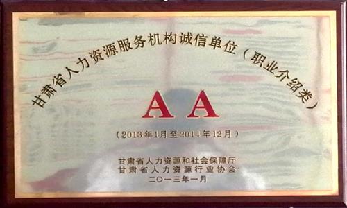 2013年2月公司職介所被甘肅省人力資源和社會保障局、甘肅省人力資源行業(yè)協會授予“AA級誠信單位”;